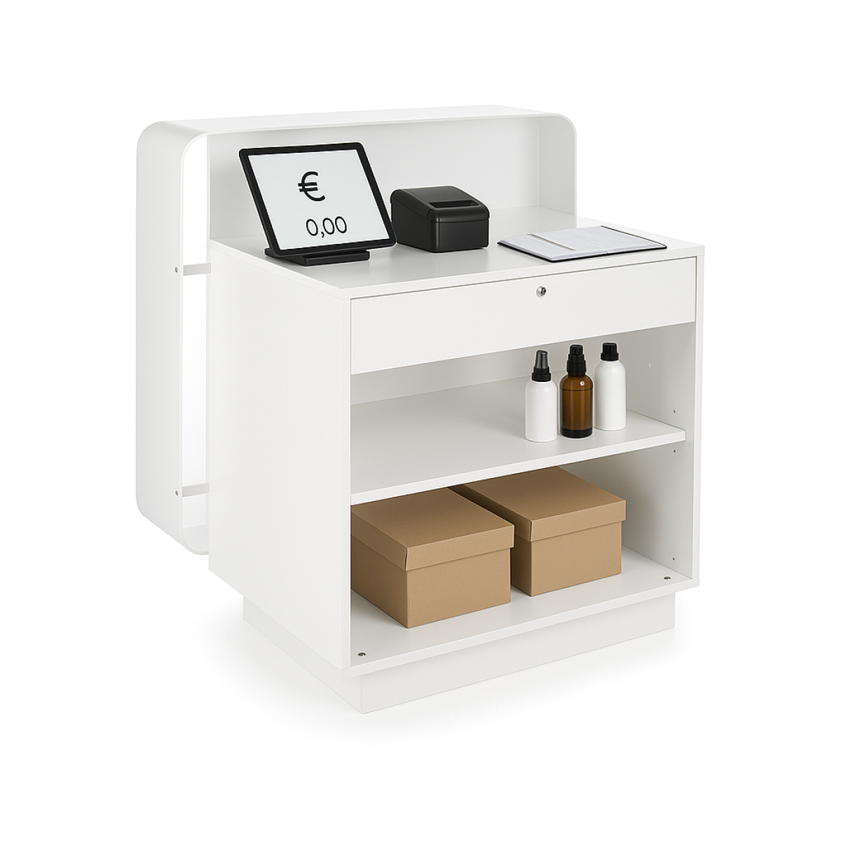 Empfangseinheit mit LED rücklichtbeleuchteter Plexiglas-Frontplatte, schwarzem oder weißem Plexiglasrahmen und hinterer Struktur aus weißem Melamin (Blanc Luxe 31) Lieferung mit einer abschließbaren Schublade und einem Regal.