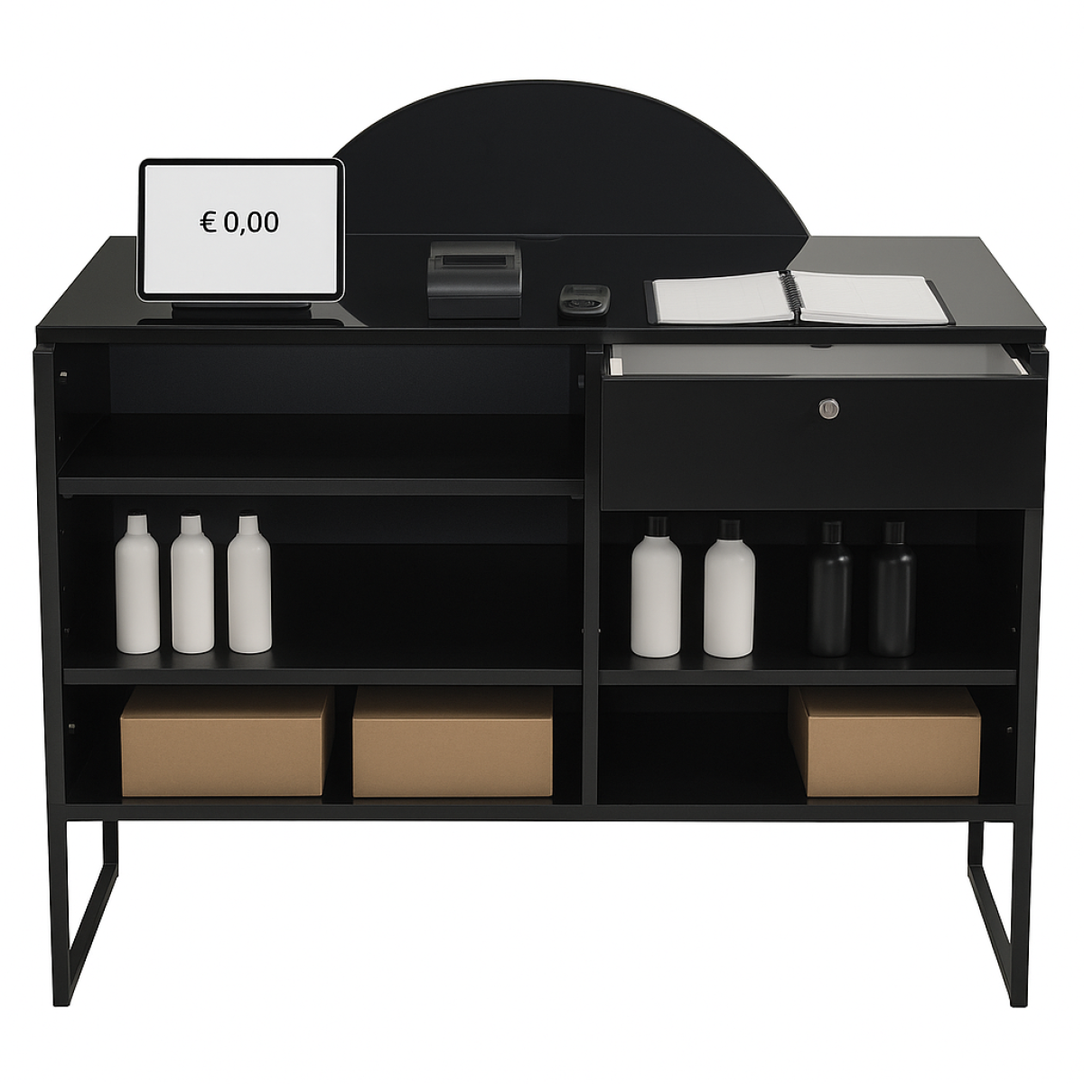 Reception desk in gloss black laminate with matt black steel legs. Front disc in matt black laminate with disk edging in gloss black. Supplied with cable port, shelves and lockable drawer. Designed to make a statement but within a small space, the floating effect of the legs enhance the desk’s elegance.