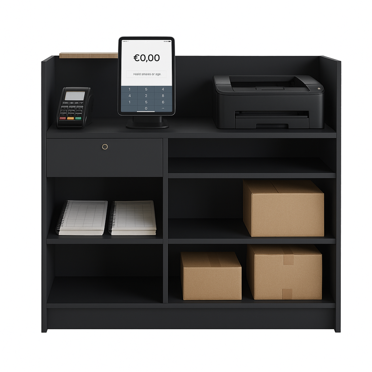 Conçu pour les salons de coiffure, le Midnight Desk allie style et fonctionnalité dans un format compact de 120 cm de large. Avec une hauteur de travail de 1 m et une hauteur totale de 1,20 m, il offre un espace d'accueil confortable et professionnel.