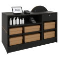 Cassa reception in nobilitato nero opaco. Decoro lineare con piatto in ottone lucido. Disco in laminato nero opaco con bordo in pvc ottone lucido.
